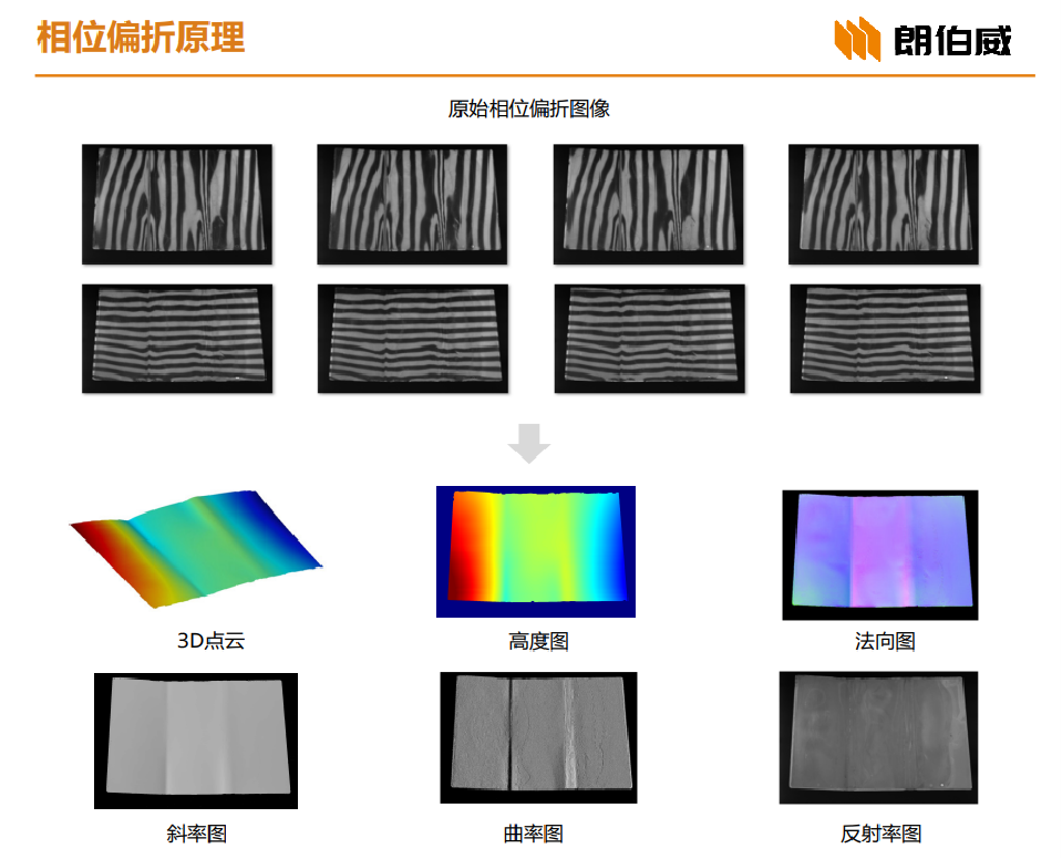 采用相位偏折原理实现对高反镜面物体的测量,可输出多种模态数据,包括点云图、高度图、斜率图、曲率图、反射率图