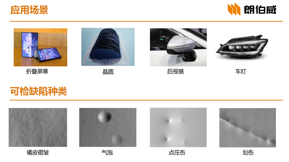 针对高反光镜面物体检测难题,搭载高对比度光源和高速相机的相位偏折测量系统,通过先进的图像合成算法,可对屏幕、玻璃、薄膜、漆面等高反表面同时进行3D尺寸测量和3.5D缺陷成像